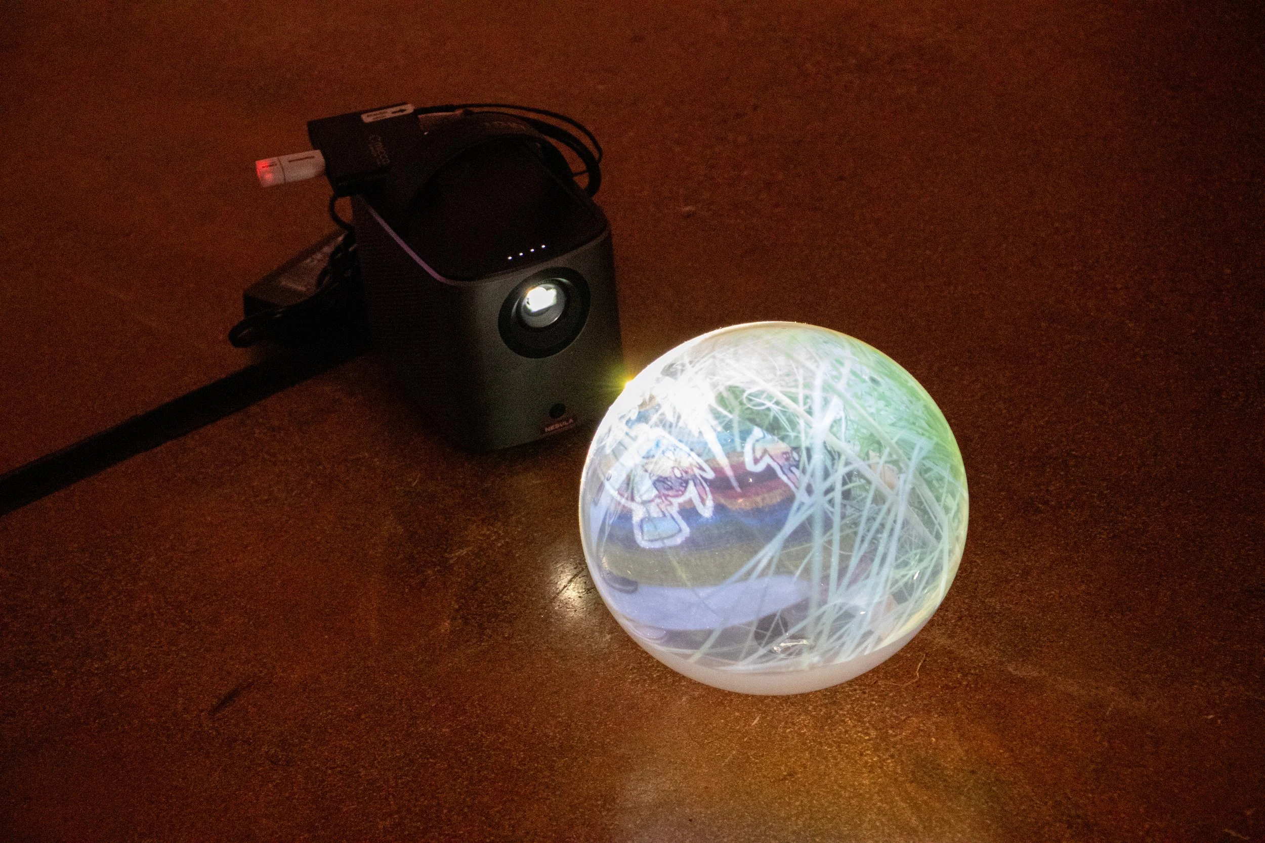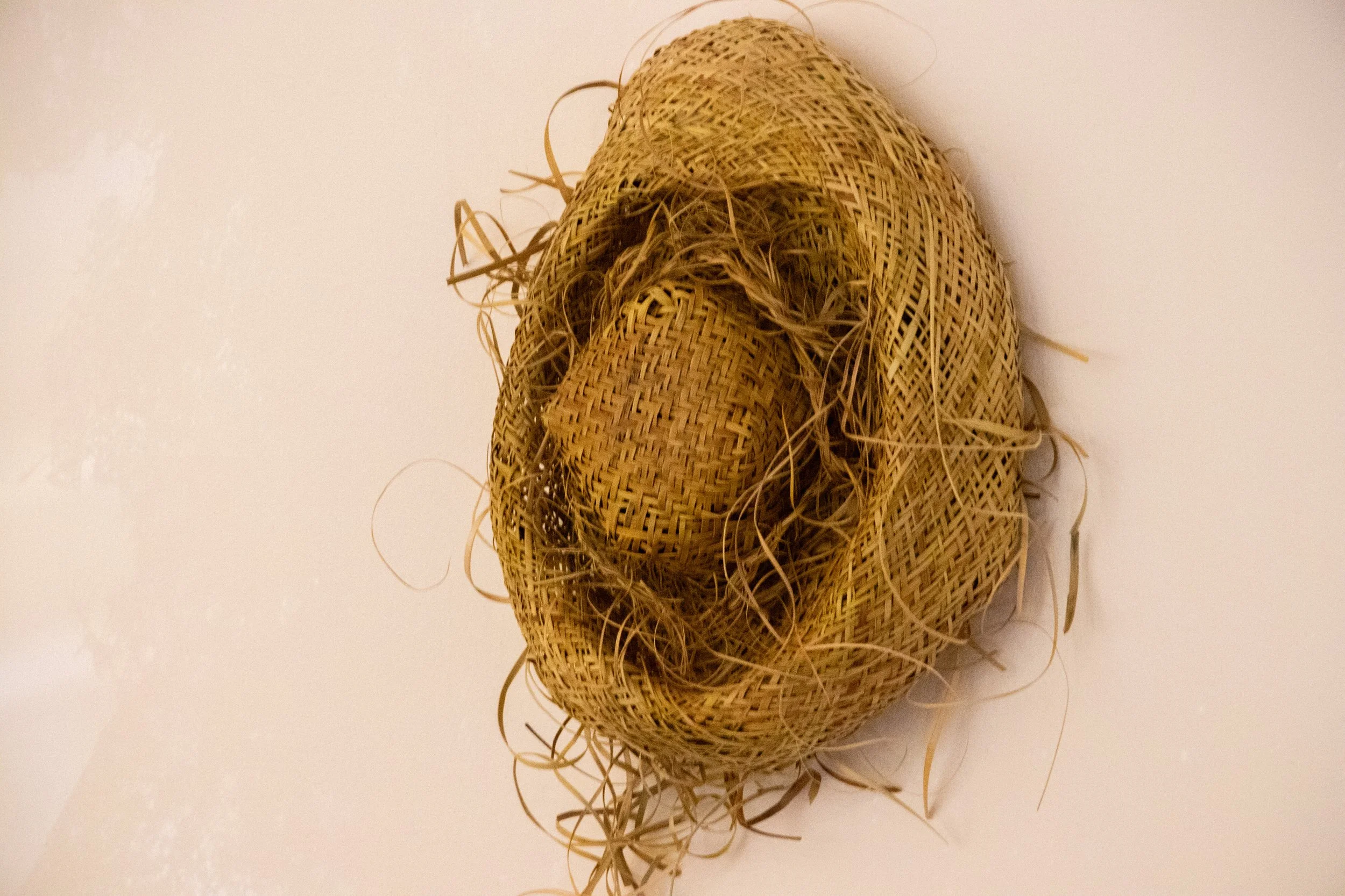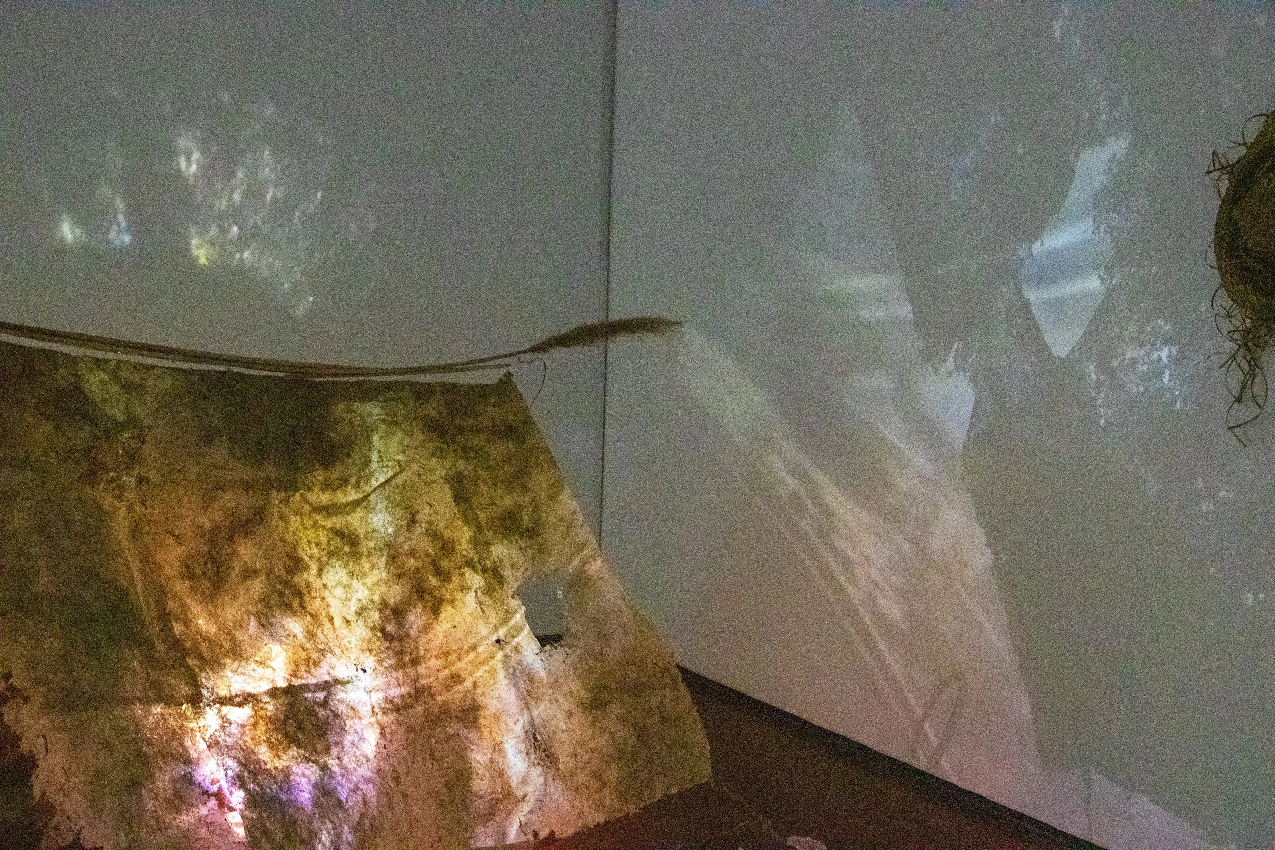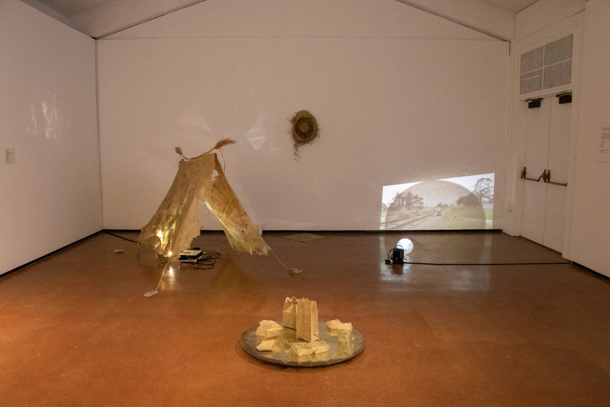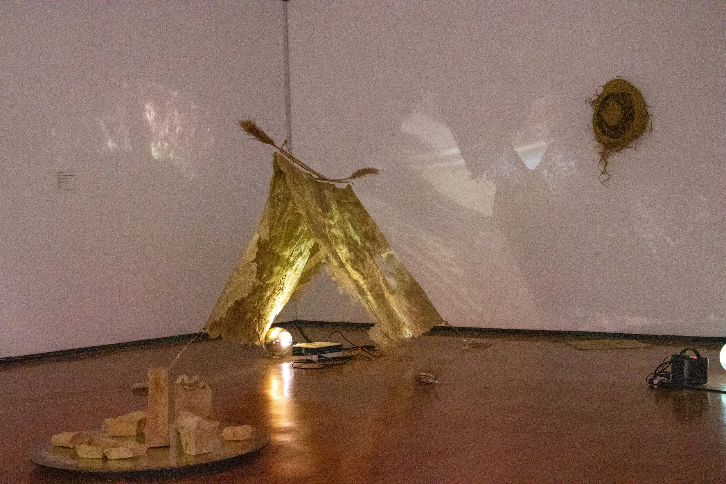 These are a series of works that respond to normative assumptions of technological progress. Building off of previous ethnographic research on the effects of Elon Musk and SpaceX’s Starbase facility in South Texas, these works explore the concept of reimagining a Martian subjectivity, a term I use to describe the alienation from land and place which arises in people who live under systems of settler colonialism, neoliberalism, and private property. Inspired by Ursula Le Guin’s works of speculative science fiction, these pieces crafting and foraging as a process oriented approach to amending my own Martian alienation from land-based practices. On the homelands of Ohlone peoples, I gathered pampas grass, a plant that is deeply invasive to coastlines globally, coming from the Pampas region of South America. It inhabits disturbed locations next to railways, highways, fences, and buildings, and it is annually cut and sprayed with herbicide as a way of managing its growth. By pulverizing its fibers into pulp, pulling it into paper sheets, folding it into recognizable consumer packaging, and weaving its sharp leaves into hats, I wanted to perform what future land based cultural practices may feel like. This installation is a culmination of my inquiry and fraught intimacy with the Pacific coast landscape. The grass paper tent serves as an ambiguous home for these ideas, and the projection and glass objects gesture towards a hybrid way of living and making in the deep future. Finally, there is a performance of the Martian foraging for pampas grass, a figure cloaked in a pikachu jorongo and woven pampas grass sombrero, cultural objects that lay in the ambiguity of Martian subjectivity.